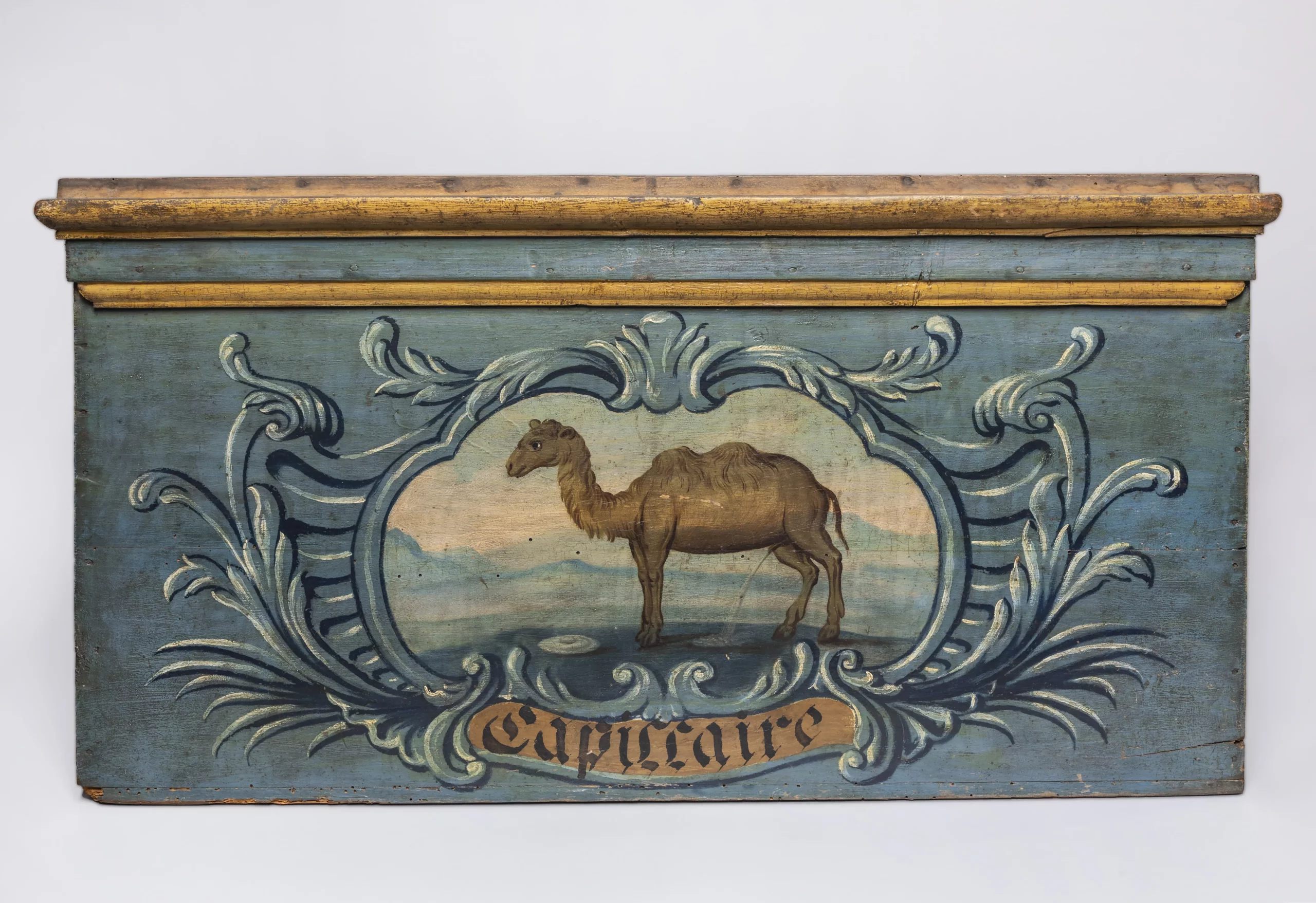 Les boîtes médicinales représentent la plus grande originalité de la collection et forment un ensemble unique en France, tant par la quantité que par la qualité des décors. Ces 319 boîtes en bois peint réparties sur six niveaux d’étagères, conservaient séchés les produits de base d’origine végétale, animale et minérale, avant qu’ils ne soient réduits en poudre et transformés en remèdes.