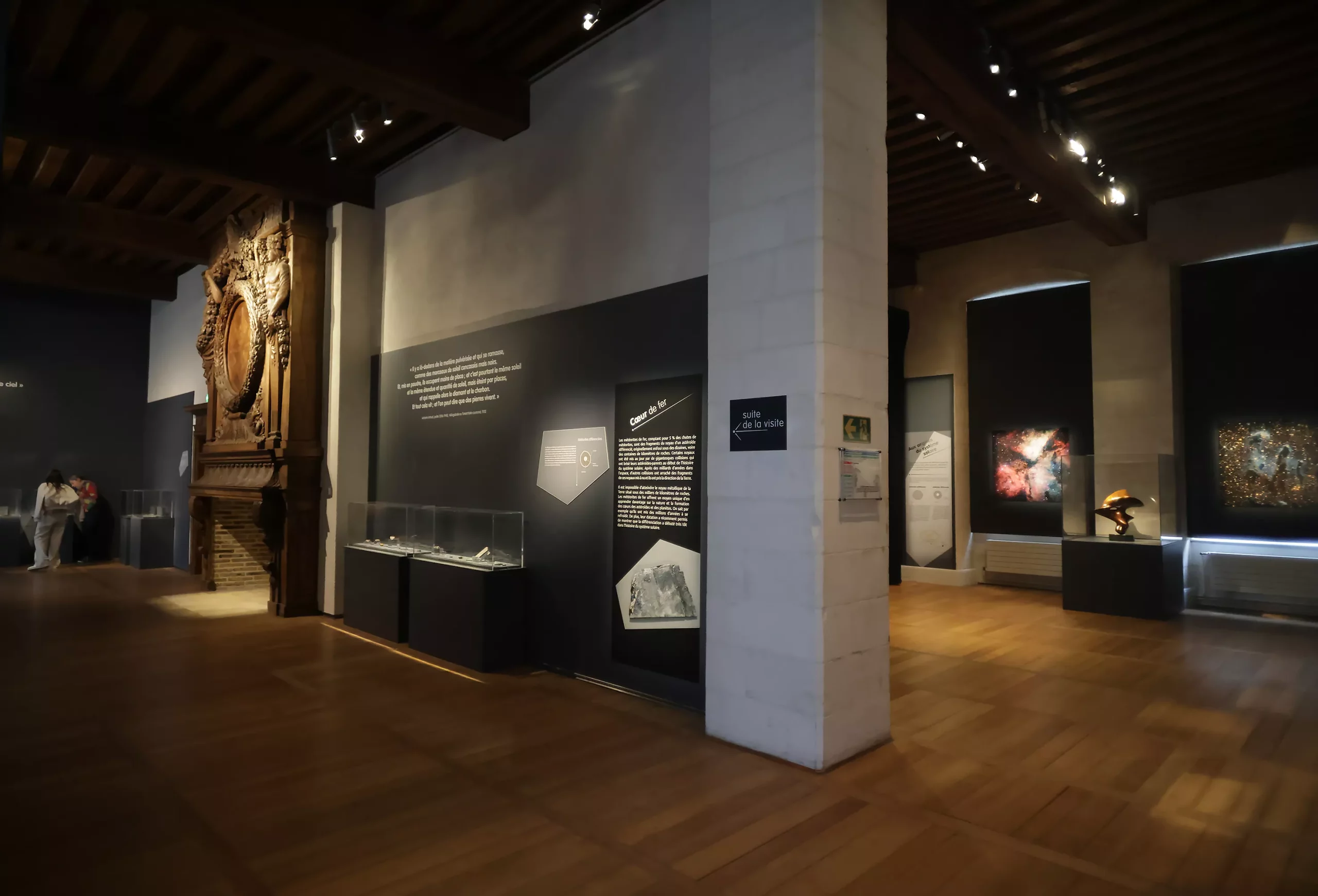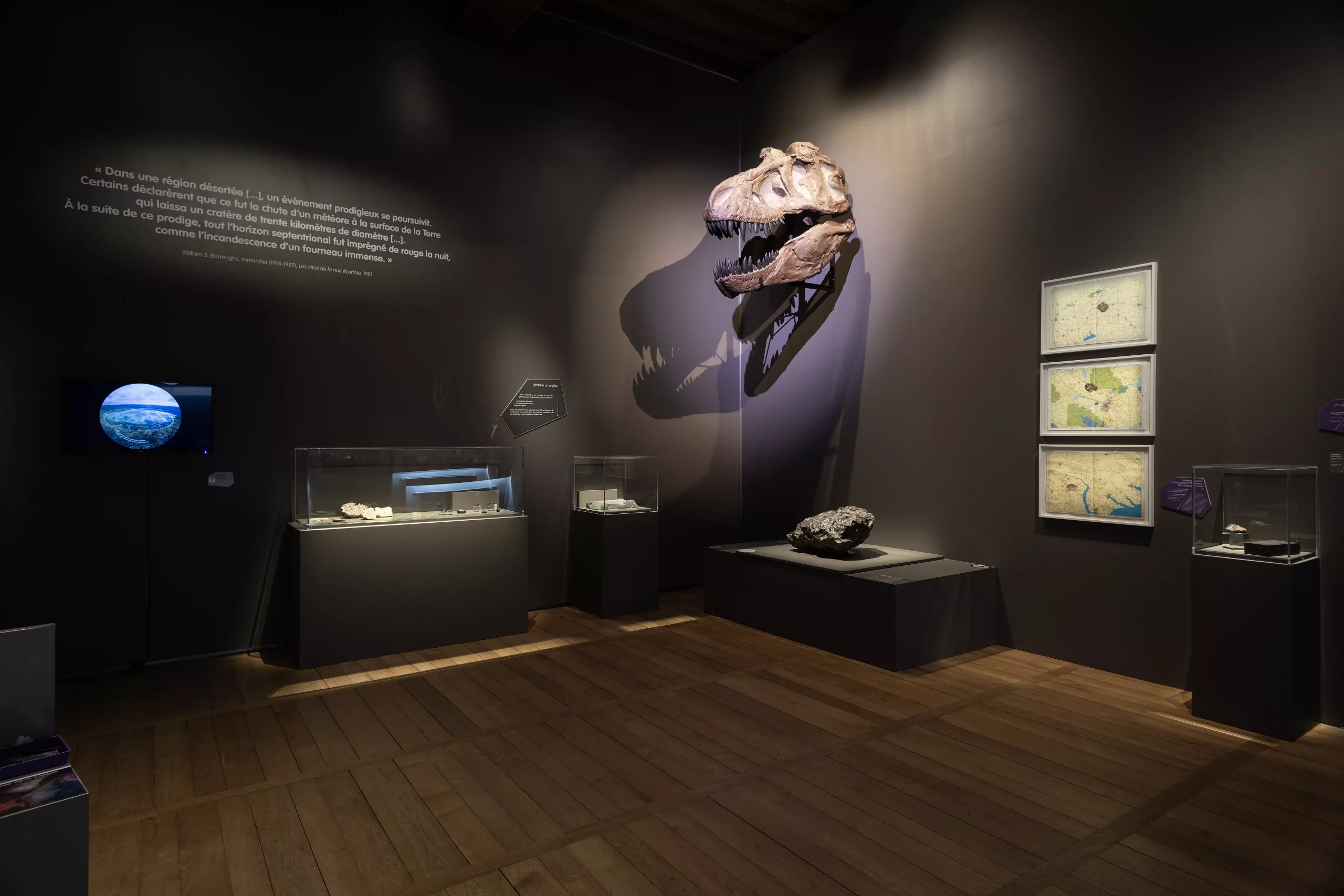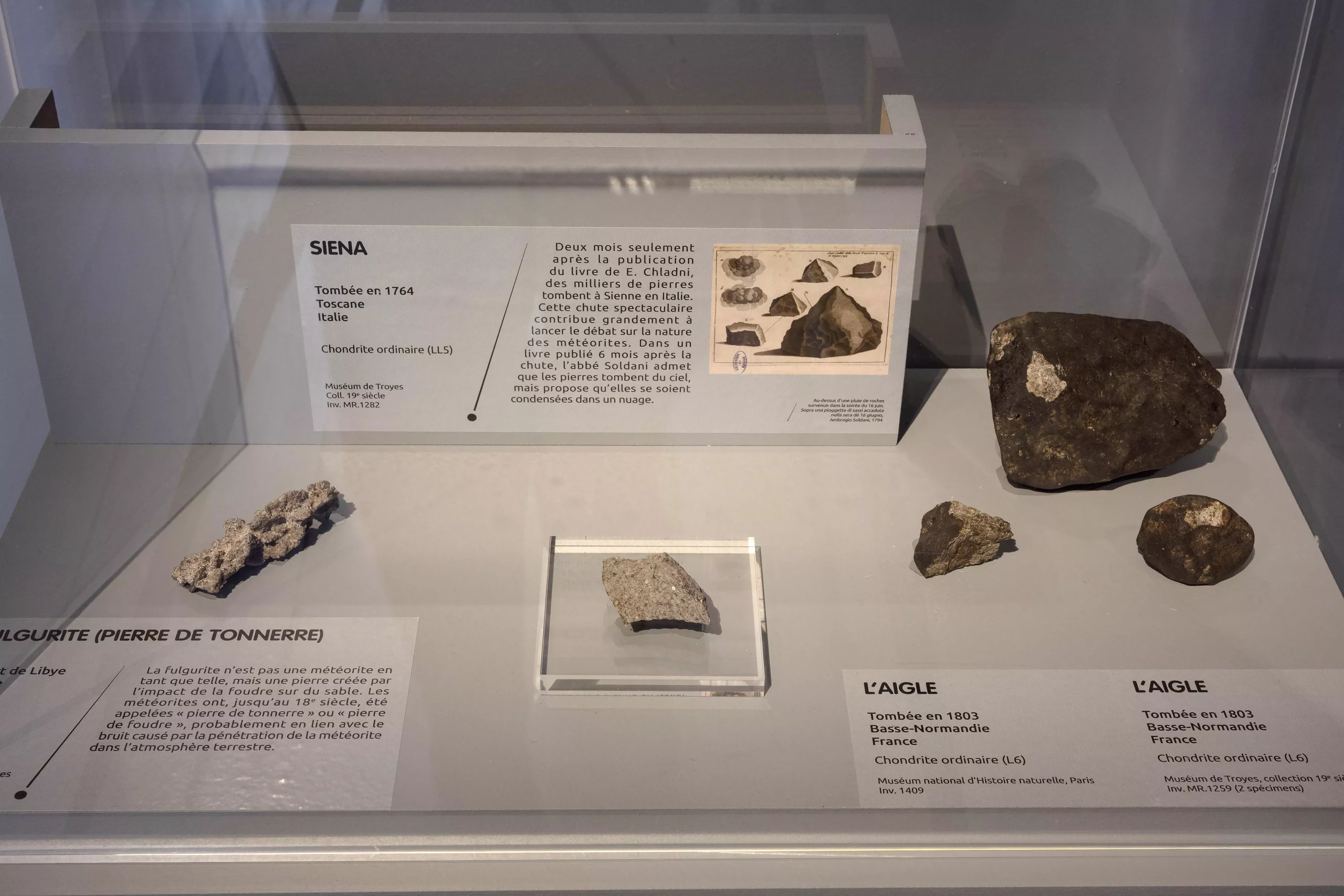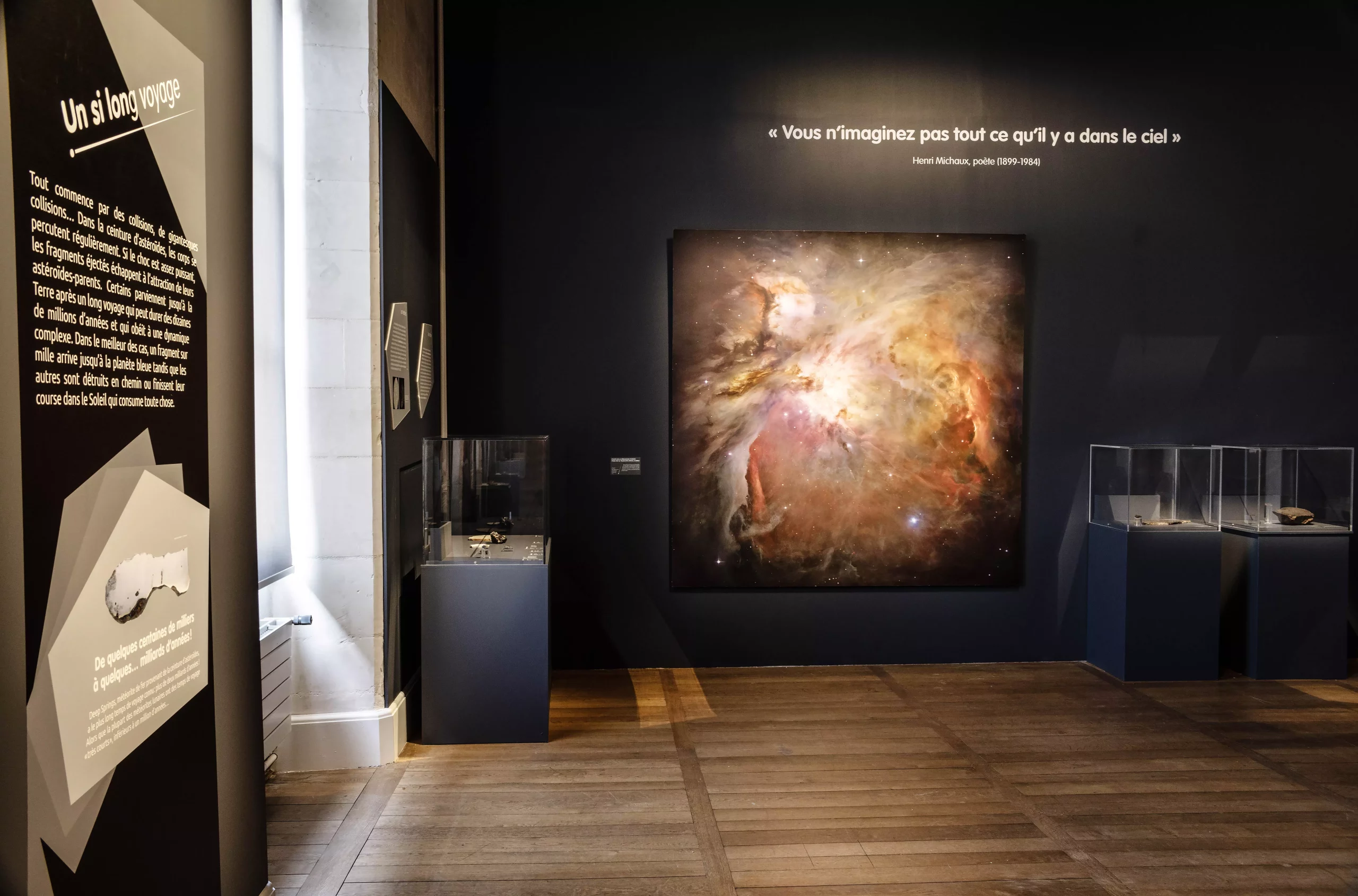 En présentant au public ces pierres extraterrestres, à la lumière des toutes dernières avancées scientifiques, l’exposition « Météorites, entre ciel et terre » convie le visiteur à un voyage dans l’espace et le temps. D’abord sur Terre, autour des chutes de météorites, depuis les étoiles filantes jusqu’aux cratères d’impacts, Puis dans l’espace, aux origines du système solaire pour découvrir la provenance et la diversité des météorites. Enfin, dans le monde de la recherche, jusqu’à la recherche spatiale. Avec une approche interactive et sensible, la scénographie propose un parcours immersif, ponctué par de nombreuses vitrines de météorites, des films surprenants et des dispositifs innovants, dans une ambiance poétique et contemporaine. Plus de 80 pièces issues des collections du muséum d’Histoire naturelle de Troyes, la 3ème collection publique de météorites en France, sont exposées aux côtés des collections du Muséum national d’Histoire naturelle, l’une des plus importantes collections mondiales par le nombre et l’intérêt scientifique de ses météorites.