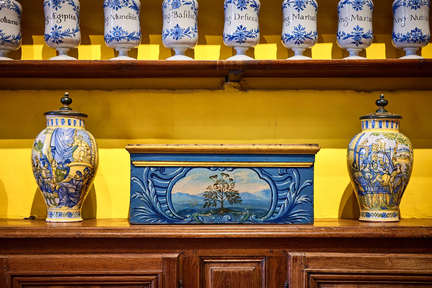 Les boiseries en chêne, datant de l’aménagement de la pharmacie entre 1704 et 1724, de style Louis XIV, sont chargées de boîtes et de faïences qui étaient remplies d’ingrédients. La monumentale échelle roulante, montée sur galets de cuivre, permet d’accéder aux rayonnages élevés. Dans cette pièce accessible uniquement à la sœur apothicaire et à ses aides, étaient conservés tous les ingrédients nécessaires à l’élaboration des remèdes, baumes, tisanes, qui étaient préparés dans la pièce voisine, appelée « laboratoire ».